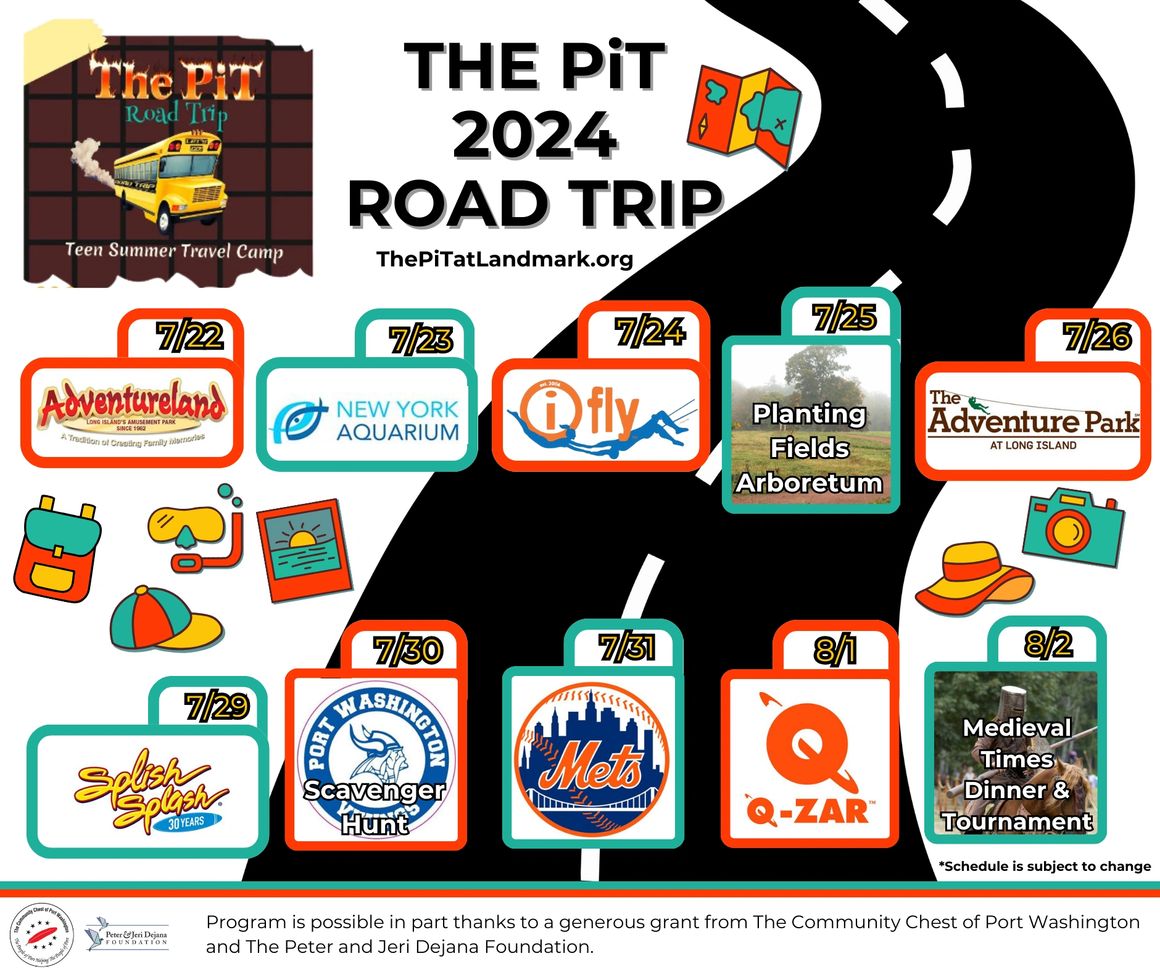 Two week road trip program (7/20-7/31) for teens, going into 6th through 9th grade. This two week program will take day trips to local amusement parks, nature centers, and adventures. Sign up your teen to enjoy this summer with The Pit, Port's Teen Center!